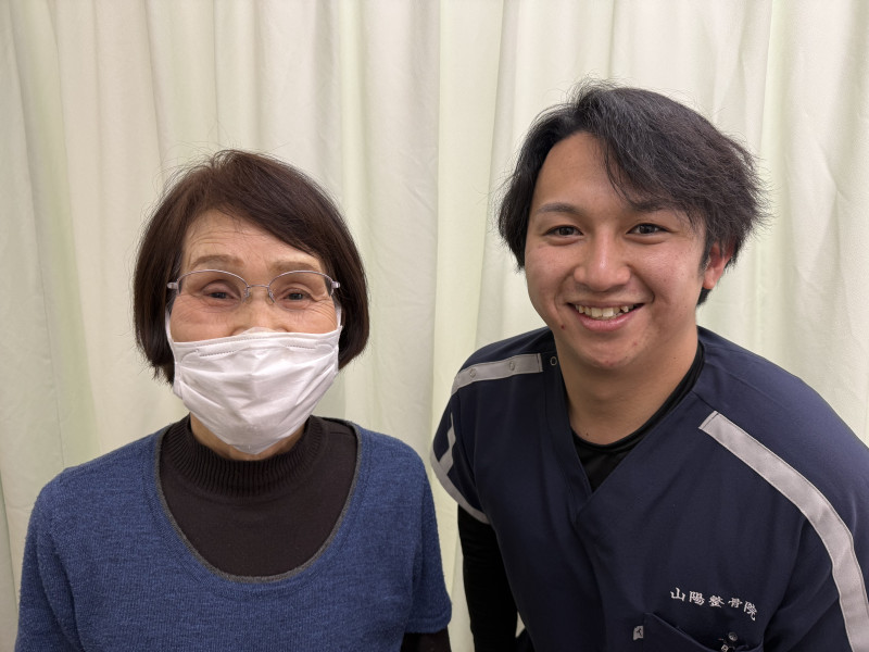 image0元々腰痛持ちの私は近くの整骨院に通っていたのですが、去年の5月くらいに、突然いつもとは違う痛みが腰や左足に走り、痛みと痺れで起床時に真っ直ぐ立って歩くことができなくなりました。不安で整形外科に行くと脊柱管狭窄症と言われ、ブロック注射を打ちました。注射を打ってもらうと、数日間は痛み・痺れは引きましたが、時間が経つとまた痛みと痺れが出る状態でした。これからもずっと注射を打ち続けなければいけないのかと思うと不安で、花壇の手入れなどの趣味も楽しくできなくなっていきました。そんなとき、娘が山陽整骨院をインターネットで見つけ、ホームページをみると、私と同じ症状の方が良くなったとの声と必ず良くするという言葉に惹かれ施術をお願いしました。わかりやすい説明としっかりした施術だったので、これなら良くなると安心して、通うことにしました。また自宅までの送迎付きのプランがあるということで移動手段が限られていた私にとってはとてもありがたかったです。今では腰や左足の痛みや痺れはなくなり、起床時も真っ直ぐ立って歩くことができるようになり、趣味の花壇の手入れや普段の生活も楽になりました。もう同じ症状にならないようにこれからも身体のメンテナンスは続けていきます。