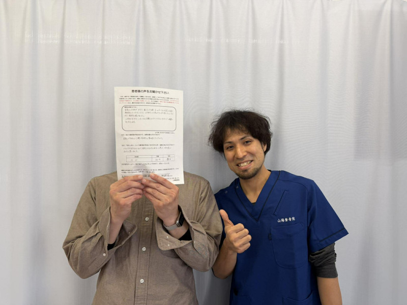 右足のしびれが酷く困っていた時、どこか良い所はないかとホームページで検索しました。お試しがあるという軽い気持ちで問い合わせ、施術を受けたところ、しびれていた足が少しずつ良くなってきたので続けてみようと思いました。ドライブが好きなので出来なくなったらどうしようと不安でしたが、杉田先生に日常での色々なアドバイスをいただきながら、しびれもなく快適に過ごすことができています。 (H・Hさん (50代 山陽小野田市)) ※効果には個人差があります |