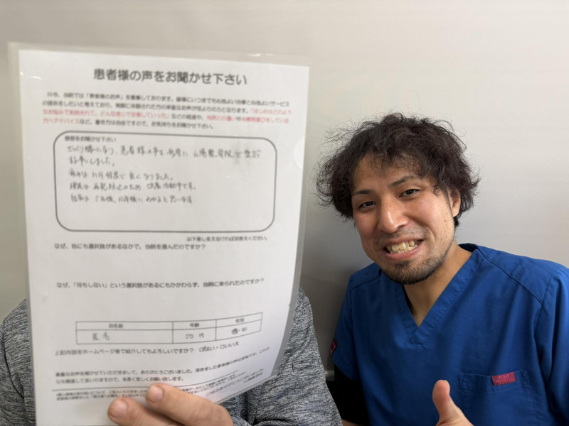 退職して5年ほど経ち、元気で悪いところは何一つなかったと自信をもっていたのですが、2年前のある朝、急に足に激痛が走り、歩けなくなってしまいました病院で腰の骨が狭くなっている狭窄症と言われ、入院し2週間薬で様子見でした。退院してからもあまり回復されず、膝、股関節も痛みがでてきたので、このままでは歩けなくなってしまうと先が不安でした。そんな時にここに来て、先生の熱意と確かな技術で、帰りはスタスタと歩けたのを今でもはっきりと覚えています。そこから早半年、また元気な体を取り戻せました。齋藤先生には感謝しかございません。人生これから!!まだまだ元気に頑張ります。 (T・Oさん (60代 山陽小野田市)) ※効果には個人差があります |