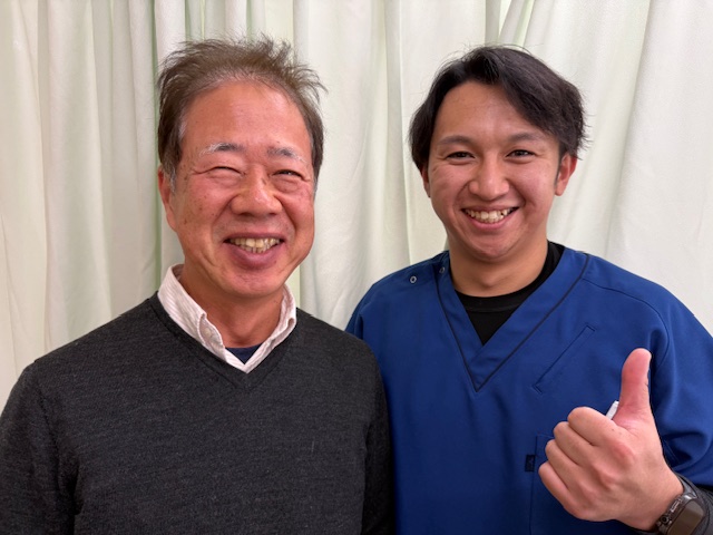「腰と膝と股関節の痛みが改善しました」 退職して5年ほど経ち、元気で悪いところは何一つなかったと自信をもっていたのですが、2年前のある朝、急に足に激痛が走り、歩けなくなってしまいました病院で腰の骨が狭くなっている(狭窄症)と言われ、入院し2週間薬で様子見でした。退院してからもあまり回復されず、膝、股関節も痛みがでてきたので、このままでは歩けなくなってしまうと先が不安でした。そんな時にここに来て、先生の熱意と確かな技術で、帰りはスタスタと歩けたのを今でもはっきりと覚えています。そこから早半年、また元気な体を取り戻せました。齋藤先生には感謝しかございません。人生これから!!まだまだ元気に頑張ります。